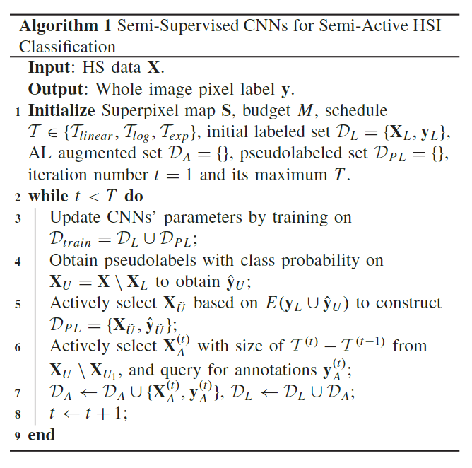 - 设计了一种新的半主动HSI分类框架工作,通过学习半监督CNNSA-CNN,简称SA-CNN,通过迭代的方式主动选择标记数据和未标记数据,允许CNN在有限的标记数据下学习更具区分性的特征。