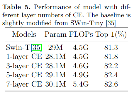 如表5所示,随着 CE 包含更多的 MBConv,Param 和 FLOPs 增长,性能从 81.8%