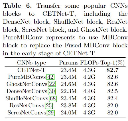 从表6可以看出,当 CETNet-T 早期的 Fused-MBConv s替换为