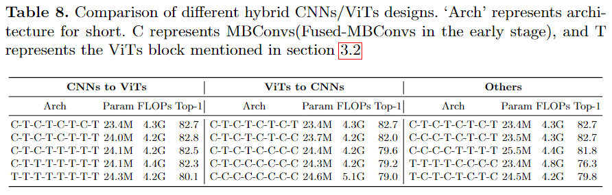 卷积 stem 在基于 ViT 的网络设计中,Stem 关注的是为后续全局注意力模块提取正确的归纳偏差。在早期阶段保持足够的感受野(ERF)以提取丰富的视觉特征是必要的 [59]。考虑到参数数量和 FLOPs 预算,以及我们注意到 S0 可以与 S1 的 CE 合并,我们的 Stem 最终由 4 个 Fused-MBConvs [21] 层和 1 个常规卷积层组成。具体来说,S0 包含 2 个 Fused-MBConv,步长分别为 2 和 1。S1 的 CE 与 S0 的 CE 构成相同,在最后跟随一个 1×1 卷积以匹配通道,并通过层归一化进行归一化 [1]。我们选择 Fused-MBConv 来组成 Stem 的另一个原因是 EfficientNetV2 [50] 表明 Fused-MBConv 在实现更好的泛化能力和容量方面非常有效,并且使训练收敛速度更快 [59]。此外,与 EfficientNetV2 一样,Fused-MBConv 和 MBConv [42] 的隐藏状态扩展比率被安排为 1 或 2。这样的设置允许卷积 Stem 具有更少的参数和 FLOPs,而不会损失准确性。有关 Fused-MBConv 和 MBConv 的更多详细信息,请参阅补充材料。 卷积嵌入 在接下来的阶段 S2、S3 和 S4 中,每个阶段包含一个 CE 块和一组 ViT 块。CE 块通过卷积归纳偏差捕获不同的深度表示,以供后续注意模块使用。值得注意的是,EarlyConv [59] 和 CoAtNet [14] 指出堆叠卷积结构可以增强早期的 ViT。然而,正如我们在表 8 中所示,我们认为 CNN 也能够表示与网络深层中的 ViT 相同(甚至更好)的深层特征。同时,保持嵌入层的 CNN 设计自然会向后续 ViT 引入适当的归纳偏差,并保留样本高效的学习特性。考虑到相同的计算资源约束,CE 仅采用有效且高效的卷积。 S2、S3、S4的CE采用 MBConv 作为基本单元。