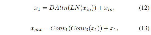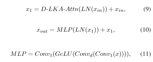2D D-LKA 块的结构包括 LayerNorm、可变形 LKA 和多层感知器